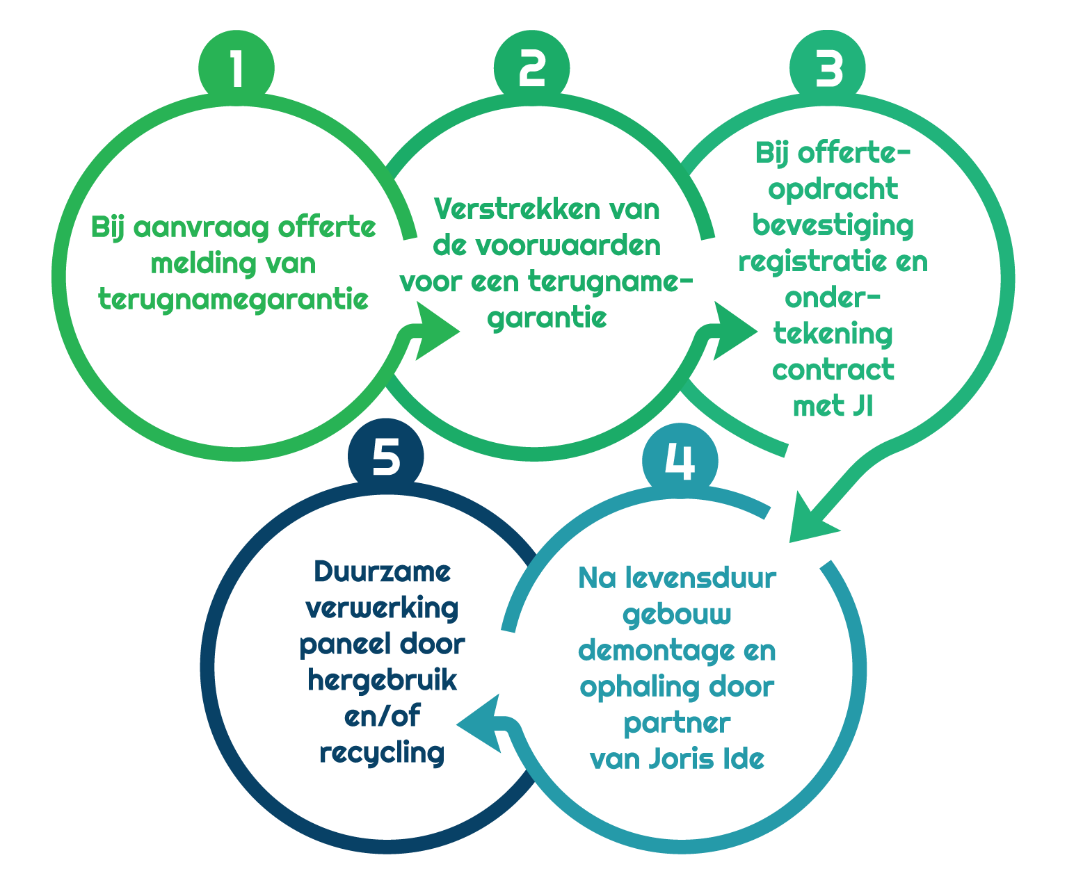 Het traject is eenvoudig: bij de offerteaanvraag wordt de terugnamegarantie vermeld, bij opdracht worden de voorwaarden bevestigd en het contract ondertekend. Na de levensduur van het gebouw verzorgt een partner van Joris ide de ophaling en volgt duurzame verwerking via hergebruik of recycling.
